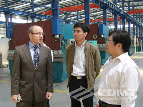 在整個的參觀過程里, EDWIN先生了解了我們先進的工廠全程監控系統,寬敞明亮的工作車間以及外形簡潔優雅的產品。相信在韓總流暢的英文翻譯下,EDWIN先生一行對本地區剪折行業的發展潛力一定有了新的認識。同時,我們很感謝韓總和EDWIN先生,他們站在一個全新的角度,對中德機床提出了建設性的建議。我們也希望中德機床精益求精,同ESTUN公司和DELEM產品建立更緊密的關系,將中德機床推向更廣闊的市場。